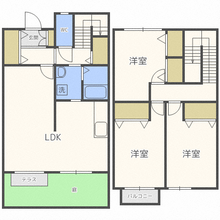 メゾネットタイプの3LDK、インターネット使い放題、追焚機能、温水洗浄便座、エアコン完備です